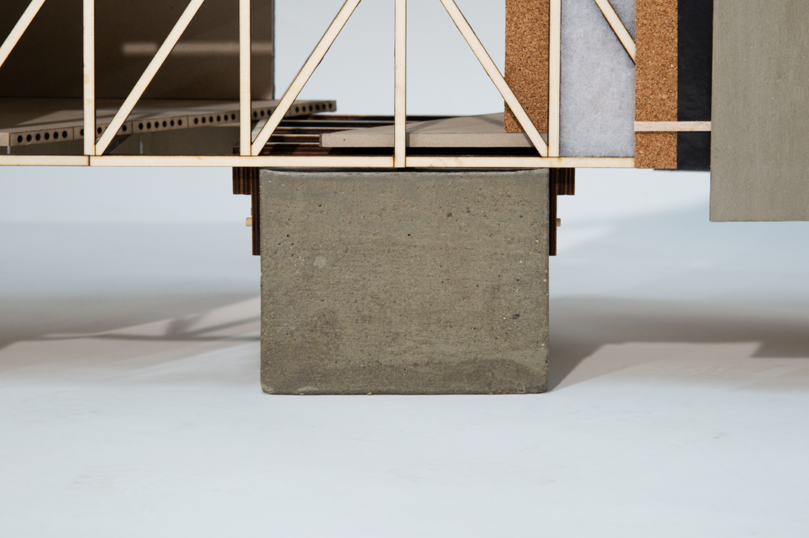 The truss system distributes the load throughout the structure from the central anchoring point, here its connection clamps the long edges of the concrete substructure, with steel rods anchoring the superstructure in place, and the connecting end, adjoined to the solid structure of the building.